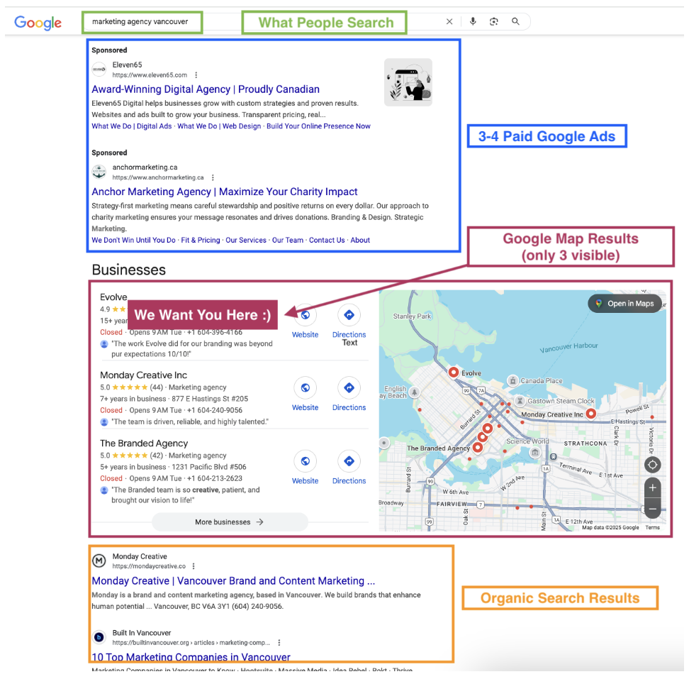Increased local map visibility captures more real estate on the Google search page. The increase in visibility and traffic will also send ranking signals that make paid campaigns more effective.